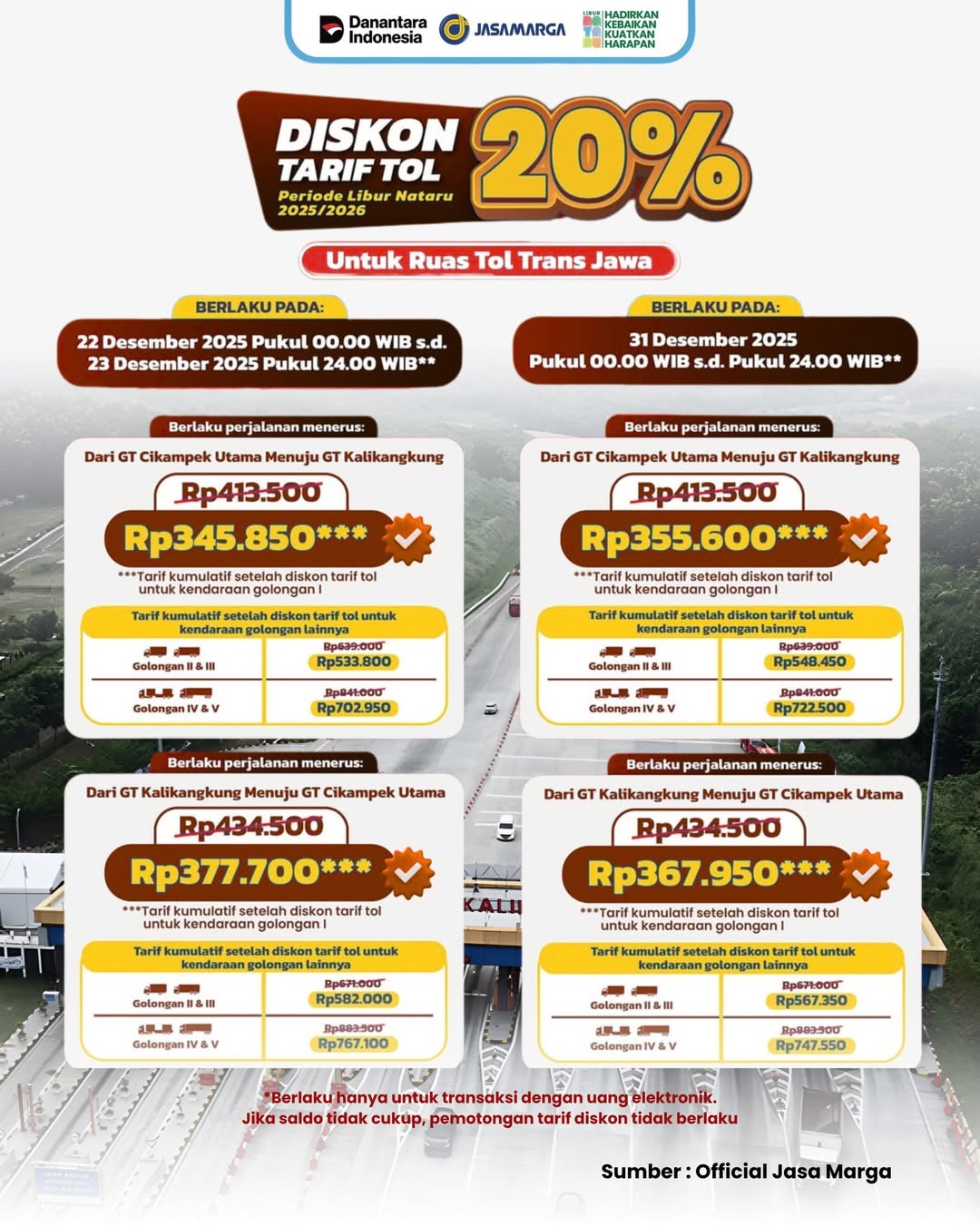 Dalam rangka mendukung kelancaran mobilitas masyarakat pada periode Libur Natal dan Tahun Baru (Nataru) 2025/2026, Jasa Marga memberikan diskon tarif tol sebesar 20% untuk pengguna jalan tol di Ruas Tol Trans Jawa.