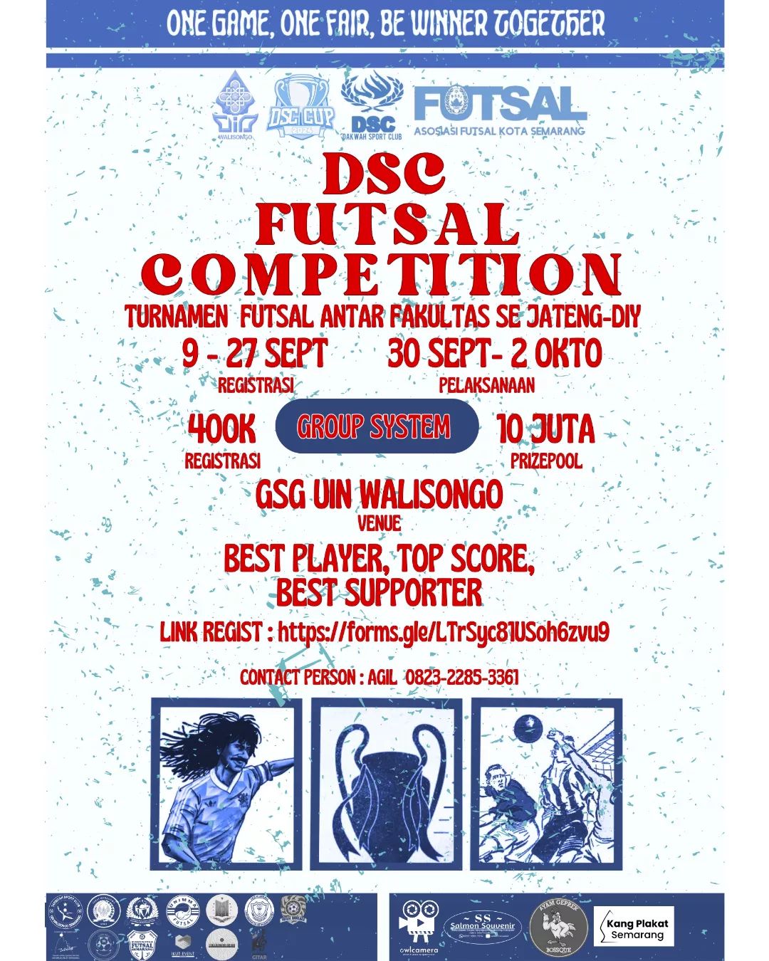 Dakwah Sport Club Walisongo Semarang kembali lagi nih !! dengan menyelenggarakan ajang perlombaan yang dapat diikuti oleh mahasiswa antar fakultas tingkat Jateng-DIY melalui “DSC Futsal Competition”