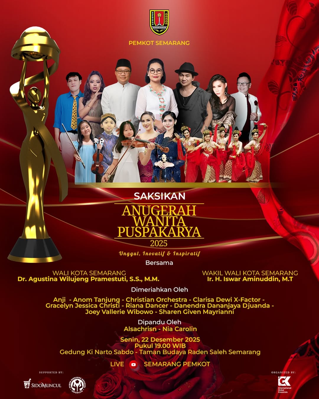 Pemerintah Kota Semarang mempersembahkan Anugerah Wanita Puspakarya 2025, sebuah malam apresiasi bagi perempuan-perempuan unggul, inovatif, dan inspiratif yang memberi kontribusi nyata bagi seni, budaya, dan kehidupan sosial.