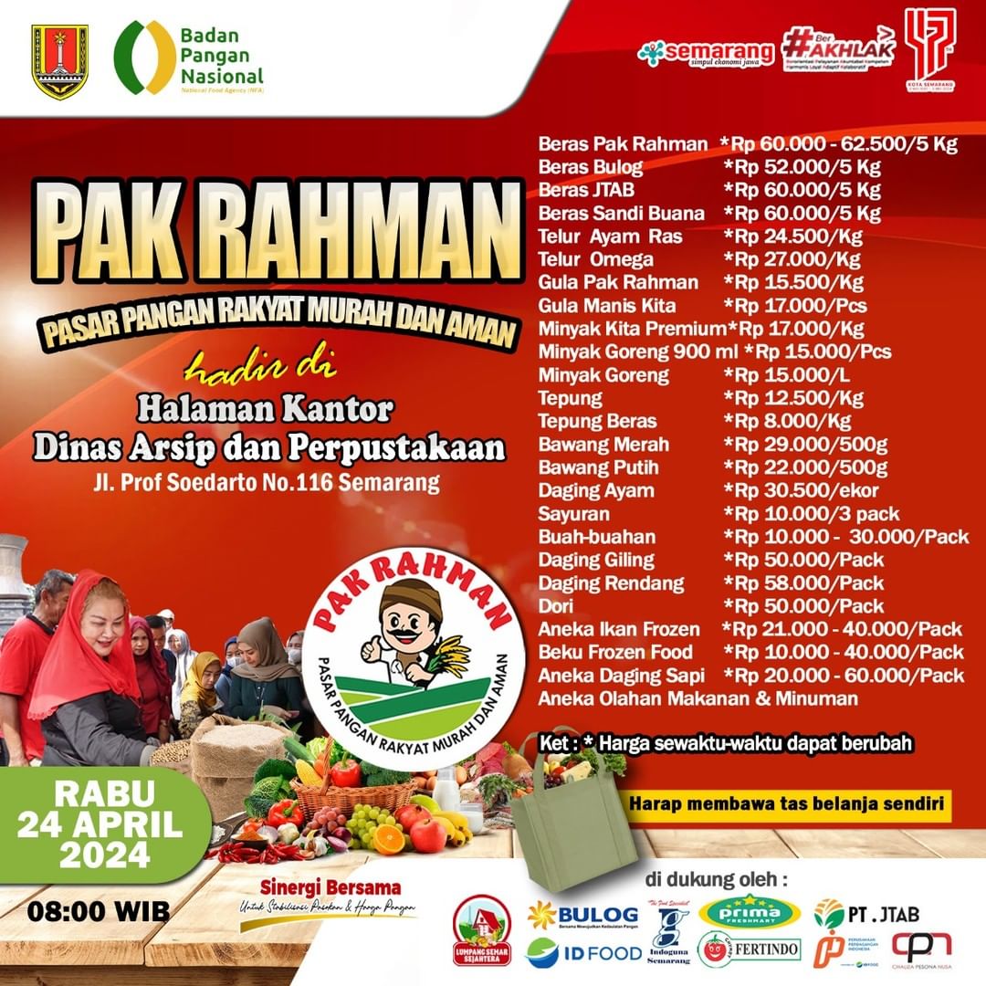 Bazar Pangan Murah Pak Rahman Dinas Arsip & Perpustakaan Kota Semarang24Apr08:0012:0008:00 - 12:00(GMT+00:00) Dinas Arsip dan Perpustakaan Kota Semarang