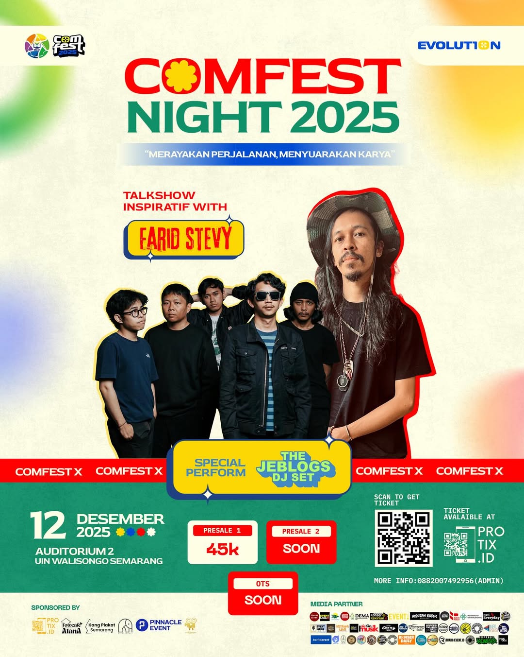 COMFEST NIGHT 2025 hadir sebagai ruang untuk merayakan perjalanan dan karya bersama. Tahun ini, kami menghadirkan format yang lebih dekat dengan audiens menggabungkan sesi inspiratif narasumber *Sirin Farid Stevy* yang akan membuka mindset kita untuk berkarya lebih. Dan penampilan spesial *Dj Set The jeblogs* dalam satu panggung yang hangat dan inklusif.