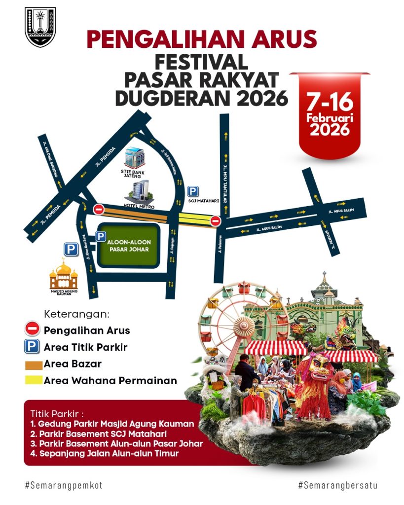 Digelar pada 7–16 Februari 2026 di area sekitar Alun-alun Masjid Agung Semarang, festival ini menghadirkan bazar UMKM, wahan permainan, hiburan rakyat, hingga pertunjukan budaya khas Dugderan.