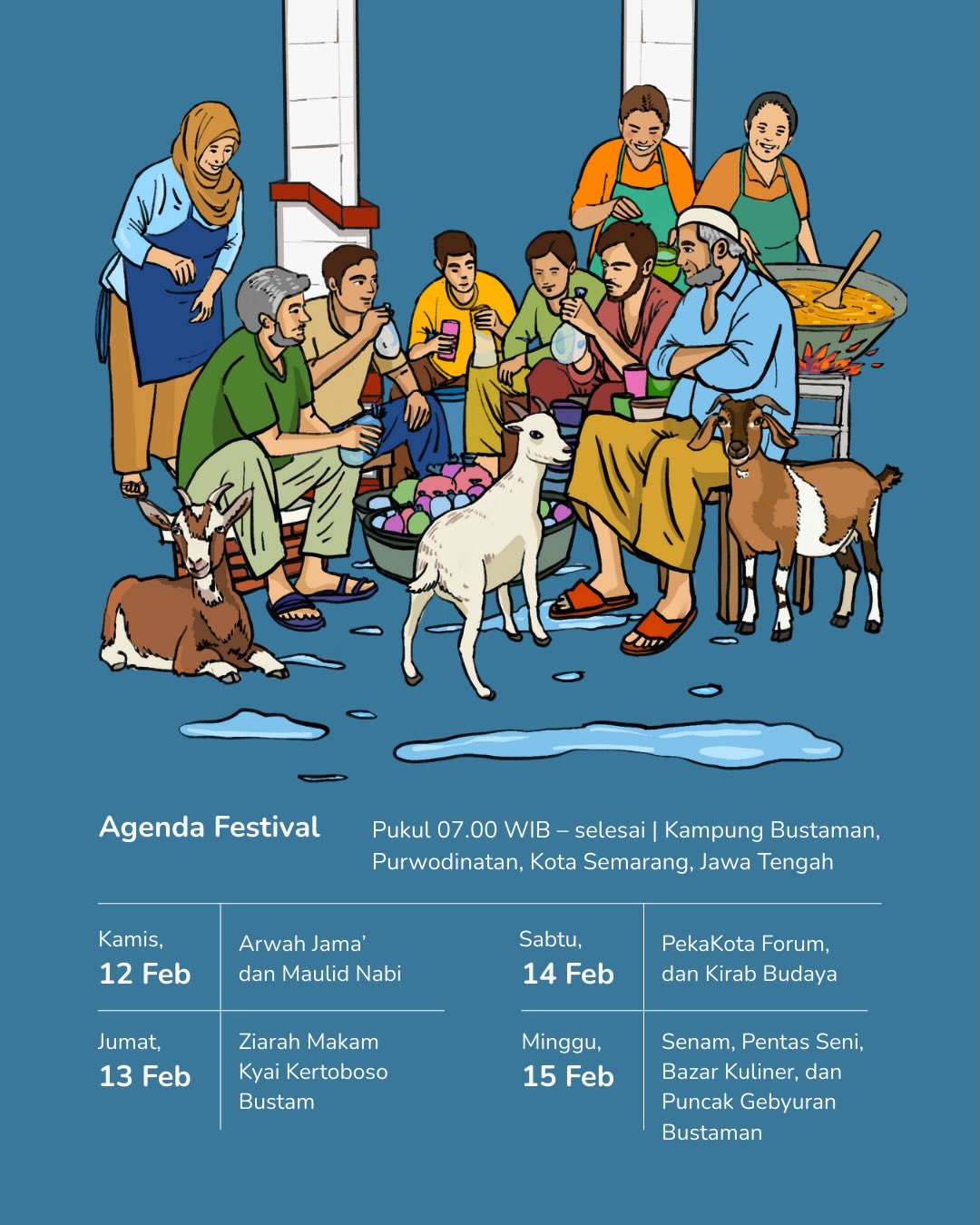Arwah Jama’, Maulid Nabi, Ziarah Kubur, Kirab Budaya, Pekakota Forum, Pentas Seni, sampai Bazar Kuliner Bustaman menjelma perayaan yang tumbuh dari rumah ke rumah, dari warga ke warga.