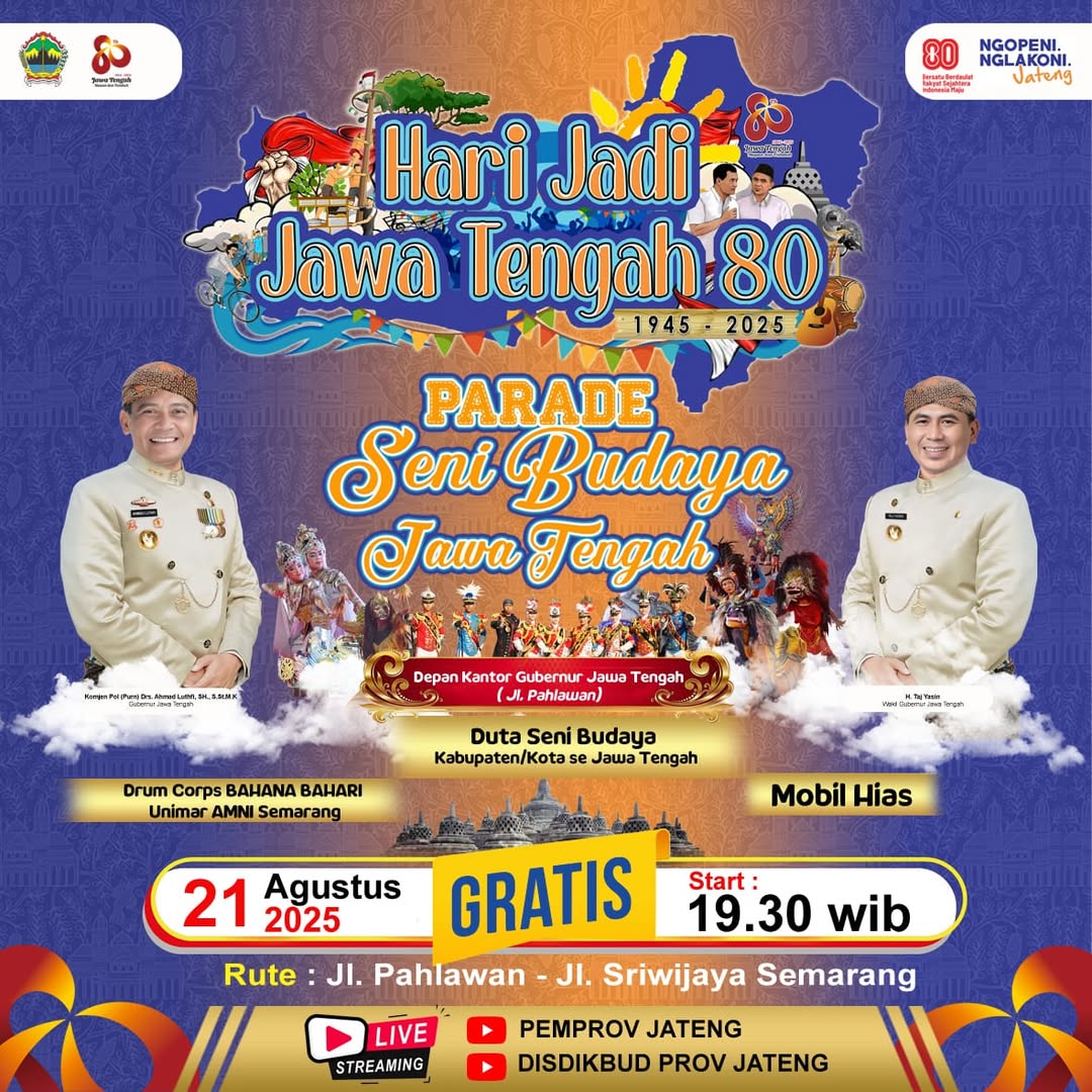 Saksikan Parade Seni Budaya Jawa Tengah dalam rangka Hari Jadi Jawa Tengah ke-80, diselenggarakan pada Kamis, 21 Agustus 2025 mulai pukul 19.30 WIB dengan rute Jl. Pahlawan -Jl. Sriwijaya.
