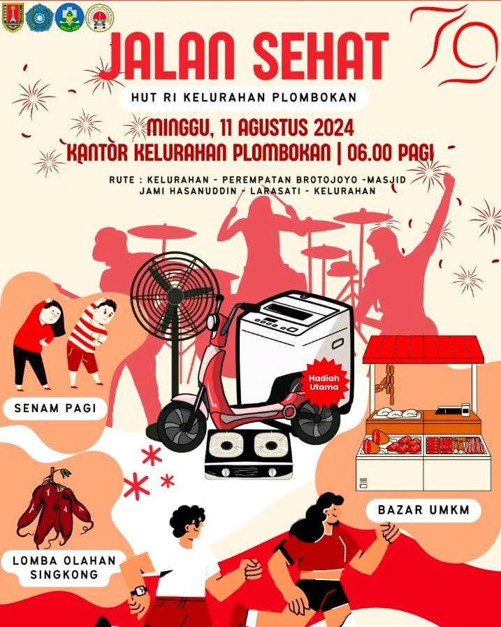Jalan Sehat Warga Plombokan merupakan rangkaian.peringatan HUT RI ke 79 tingkat Kelurahan dineriahkan dengan senam bersama, bazar UMKM,lomba olahan singkong,bernyanyi dan betjofet bersama,tentunya dengan bertebarnya doorprize utama sepeda listrik,mesin cuci, kipas angin,kompor gas dan puluhan hadiah lainnya…yuk ramaikan ya..