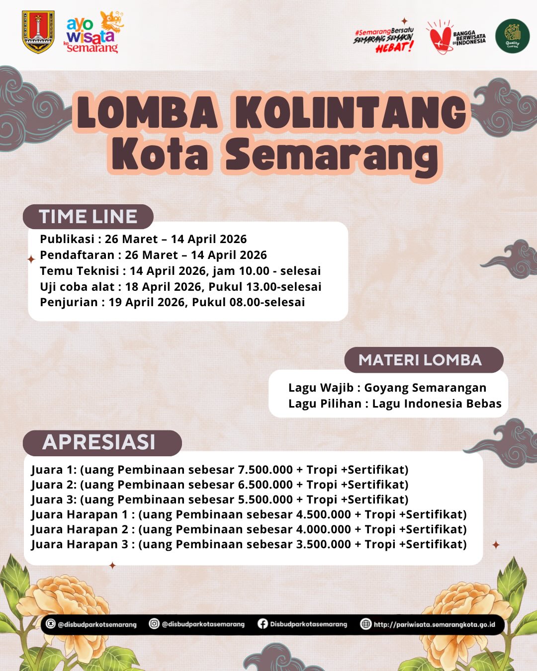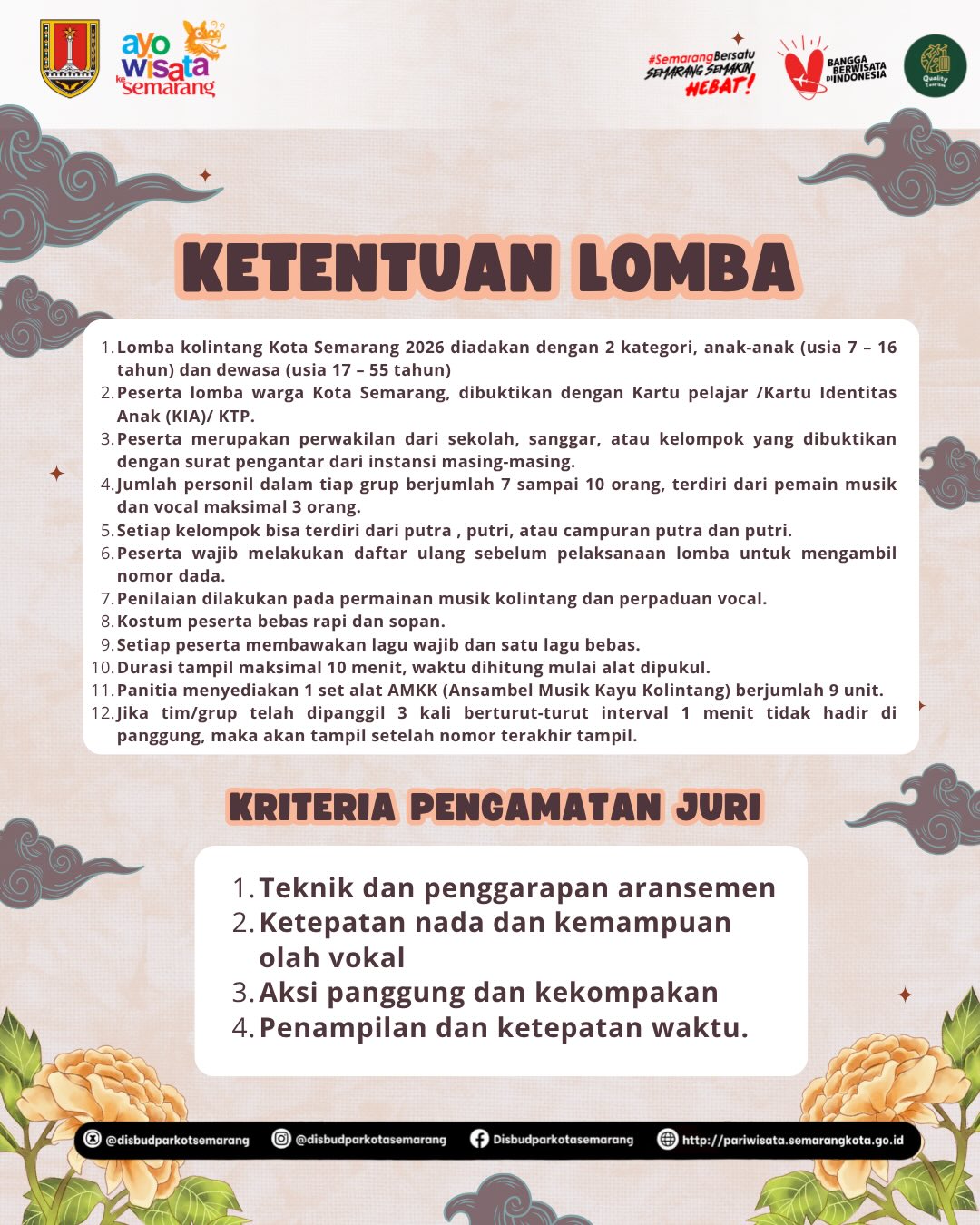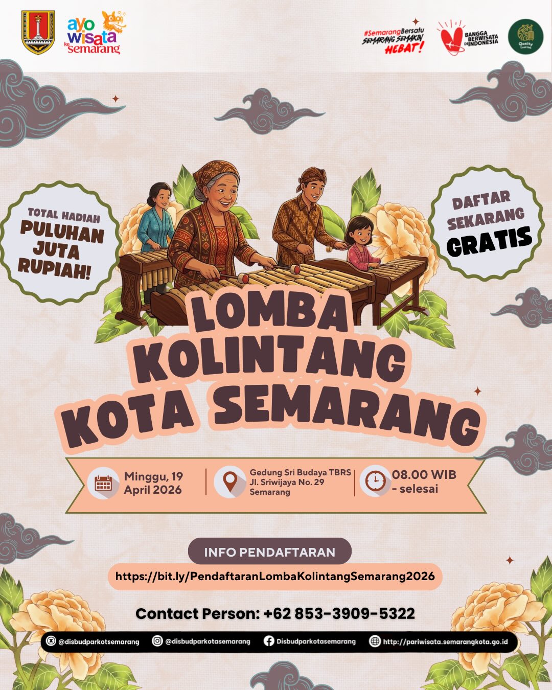 Pendaftaran di buka hingga tanggal 14 April 2026 dengan link pendaftaran https://bit.ly/PendaftaranLombaKolintangSemarang2026 😍✨