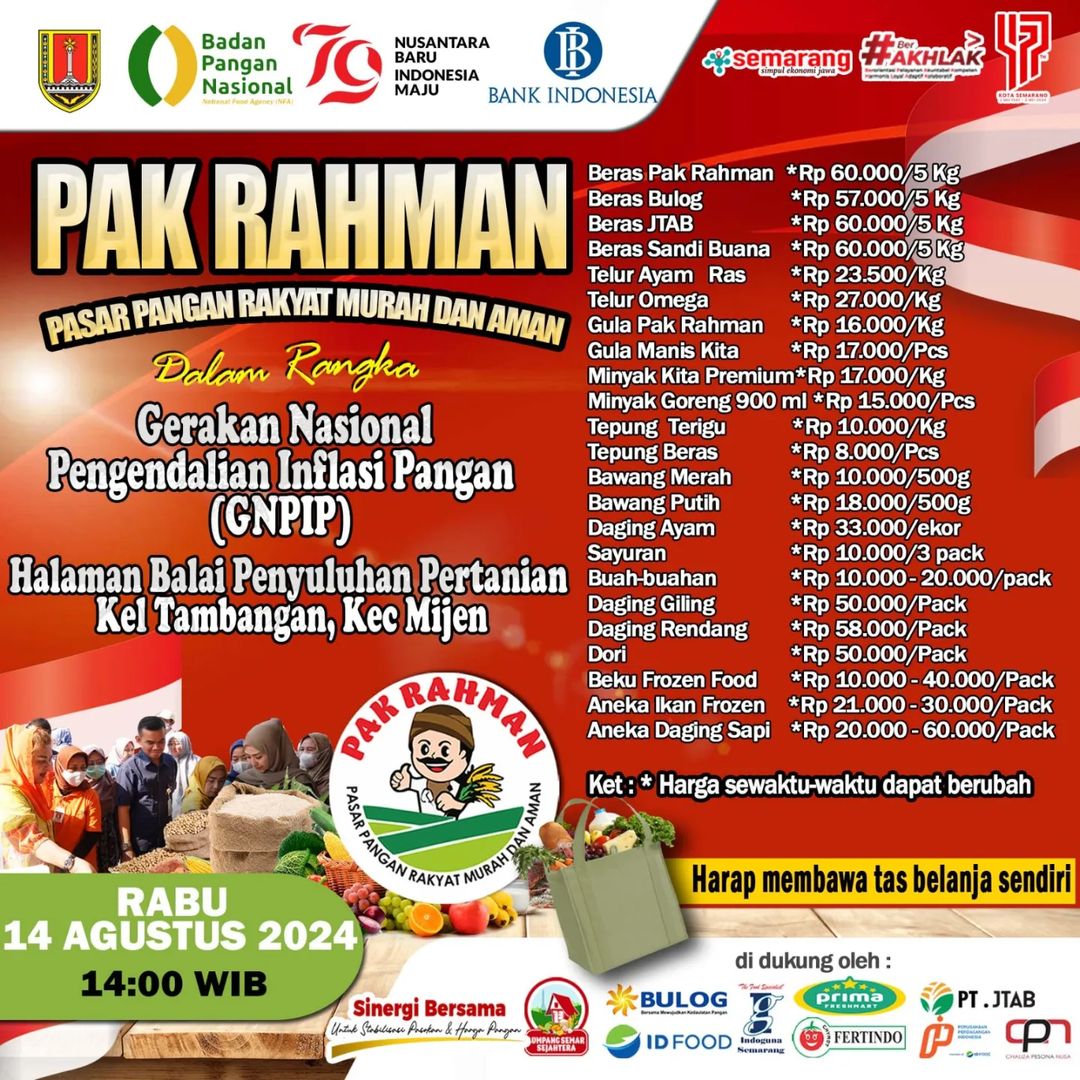 Gerakan Pangan Murah melalui “PAK RAHMAN” Pasar Pangan Rakyat Murah dan Aman akan hadir dalam rangka Gerakan Nasional Pengendalian Inflasi Pangan (GNPIP) yang akan diselenggarakan di :