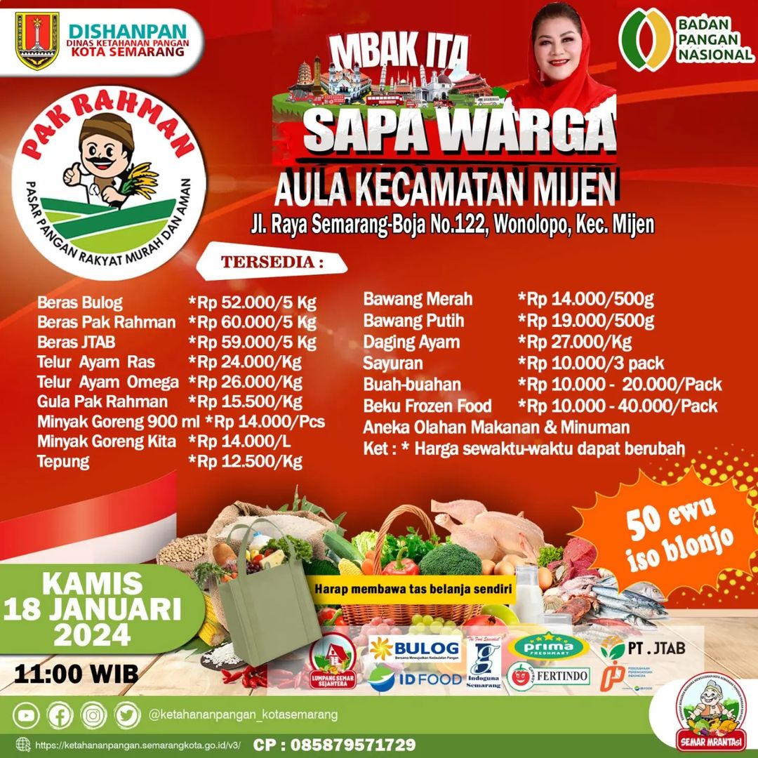 Jangan lupa, “PAK RAHMAN” Pasar Pangan Rakyat Murah dan Aman hadir dalam kegiatan “MBAK ITA SAPA WARGA” di