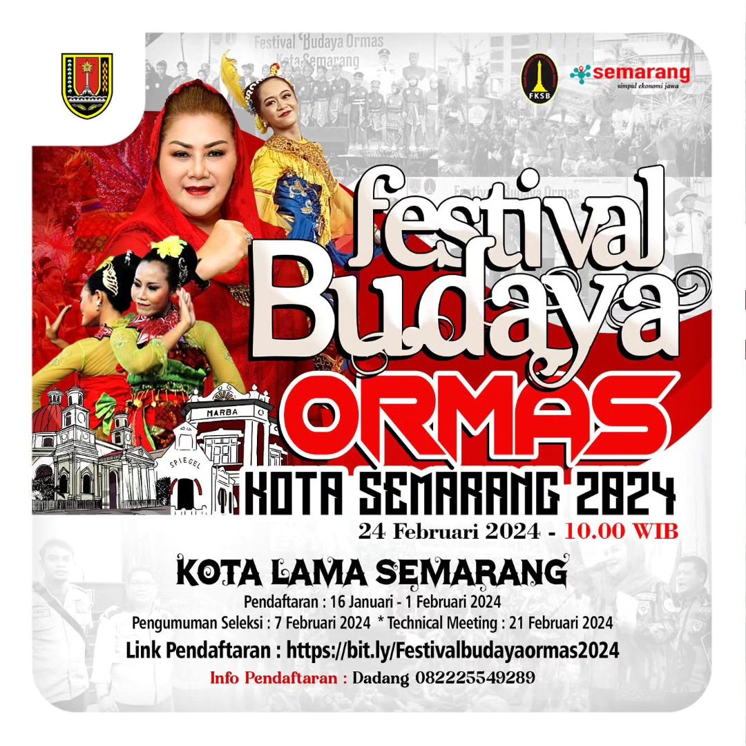 Festival Budaya Ormas hadir lagi nih! Ayo Lur kita ramaikan Festival Budaya Ormas Kota Semarang 2024 pada tanggal 24 Februari 2024 jam 10.00 WIB di Kota Lama Semarang!