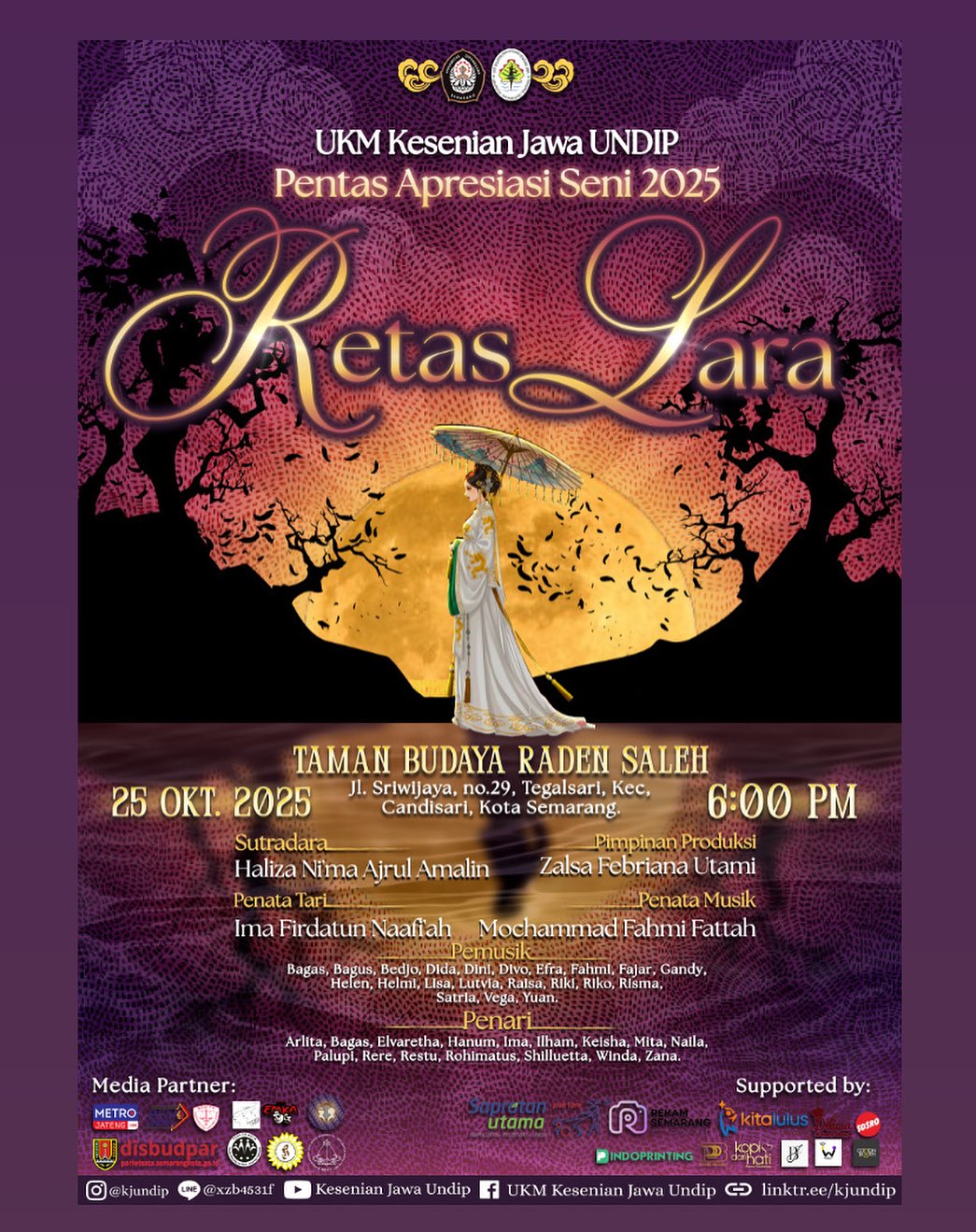 Acara akan digelar pada Sabtu, 25 Oktober 2025 pukul 18.00 WIB di Gedung Baru Taman Budaya Raden Saleh. Untuk info tiketnya koncodolan bisa cek di @kjundip