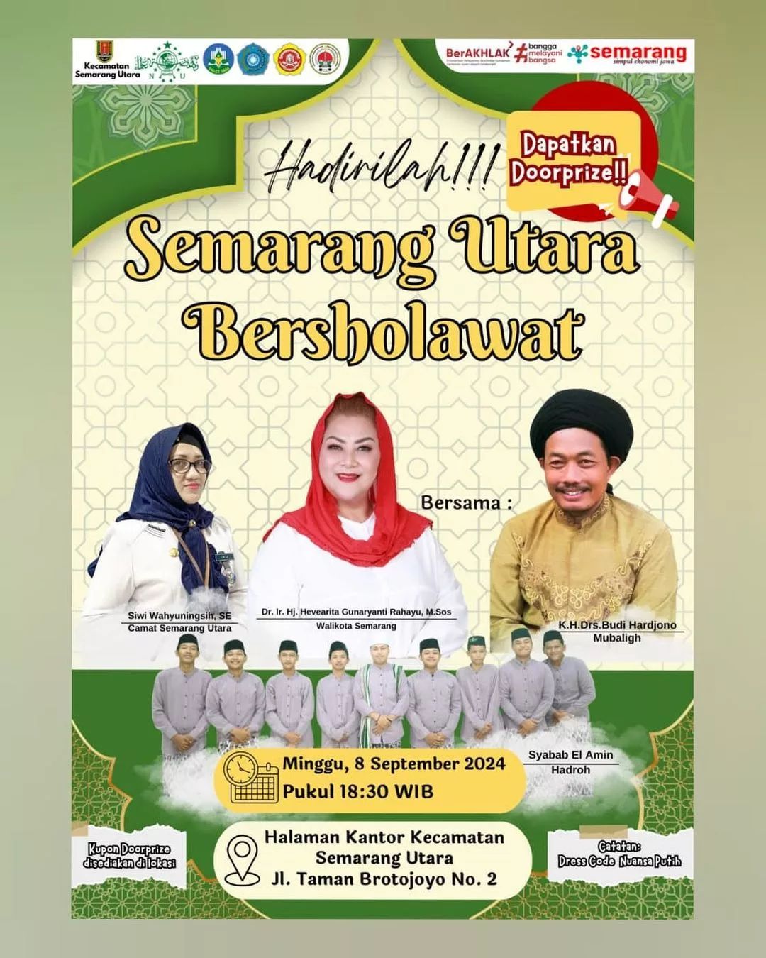 Halo, Warga Semarang Utara dan Sekitarnya Pemerintah Kota Semarang bersama Kecamatan Semarang Utara akan mengadakan Semarang Utara Bersholawat yang dimeriahkan oleh beberapa tokoh besar, pada: