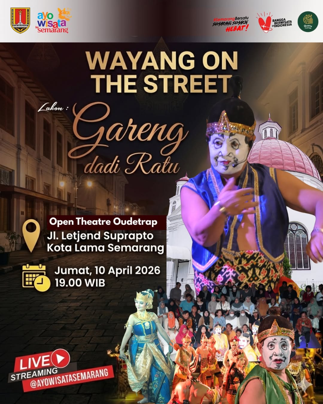 Berlangsung Jumat, 10 April 2026 pukul 19.00 di Open Teater Oudetrap Kota Lama dengan lakon “Gareng Dadi Ratu” GRAAATISS✨✨