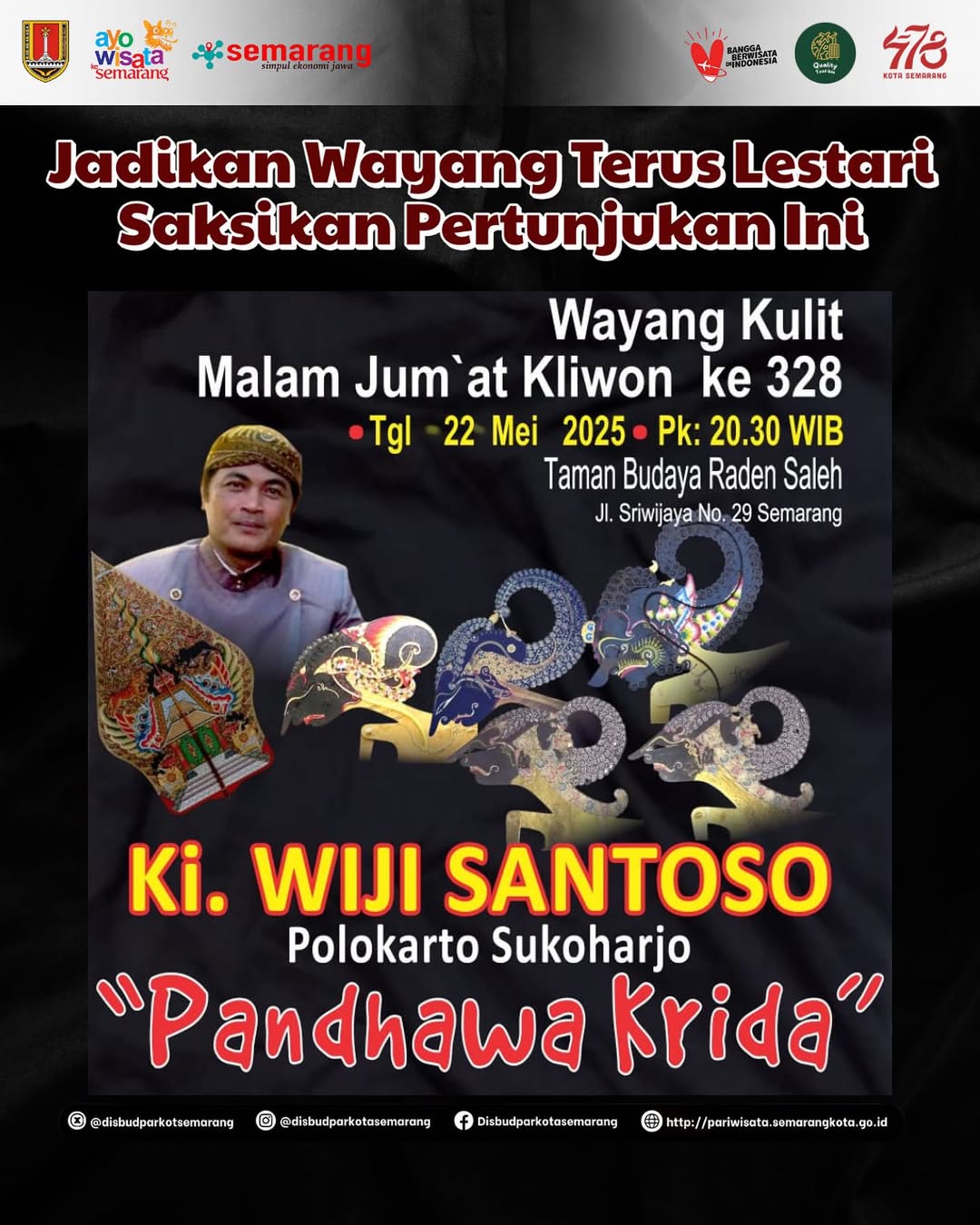 Pertunjukan ini akan berlangsung pada 22 Mei 2025 pukul 20.30 dengan lakon “Pandhawa Krida” yang akan dibawakan oleh dalang Ki Wiji Santoso