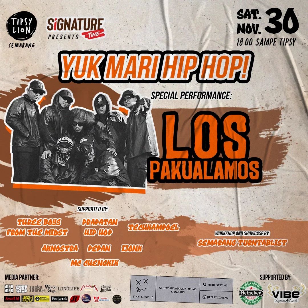 Yuk Mari HipHop kembali digelar lagi di Tipsylion semarang, mengundang para Kawan kawan untuk turut serta meramaikan pada Sabtu, 30 Nov 2024 dan akan di meriahkan oleh :