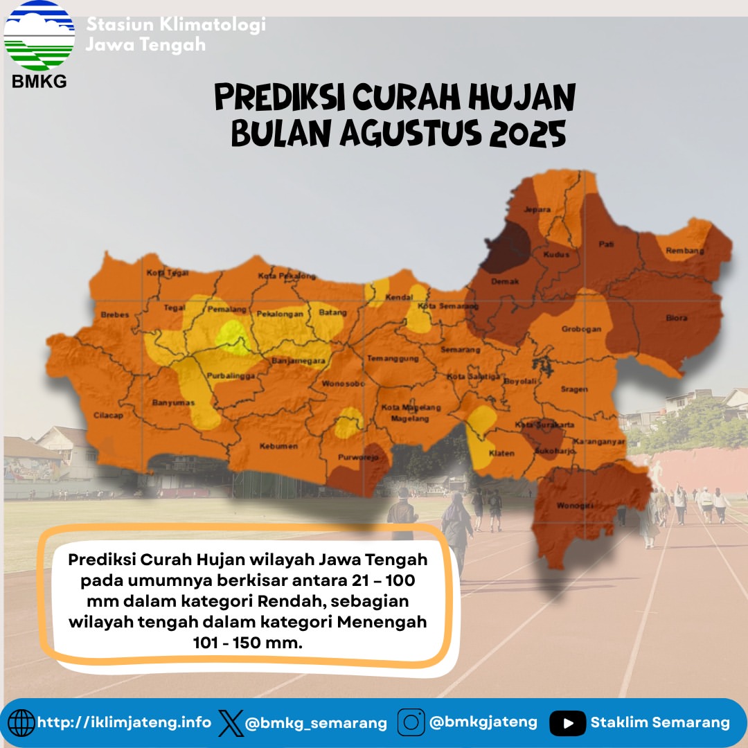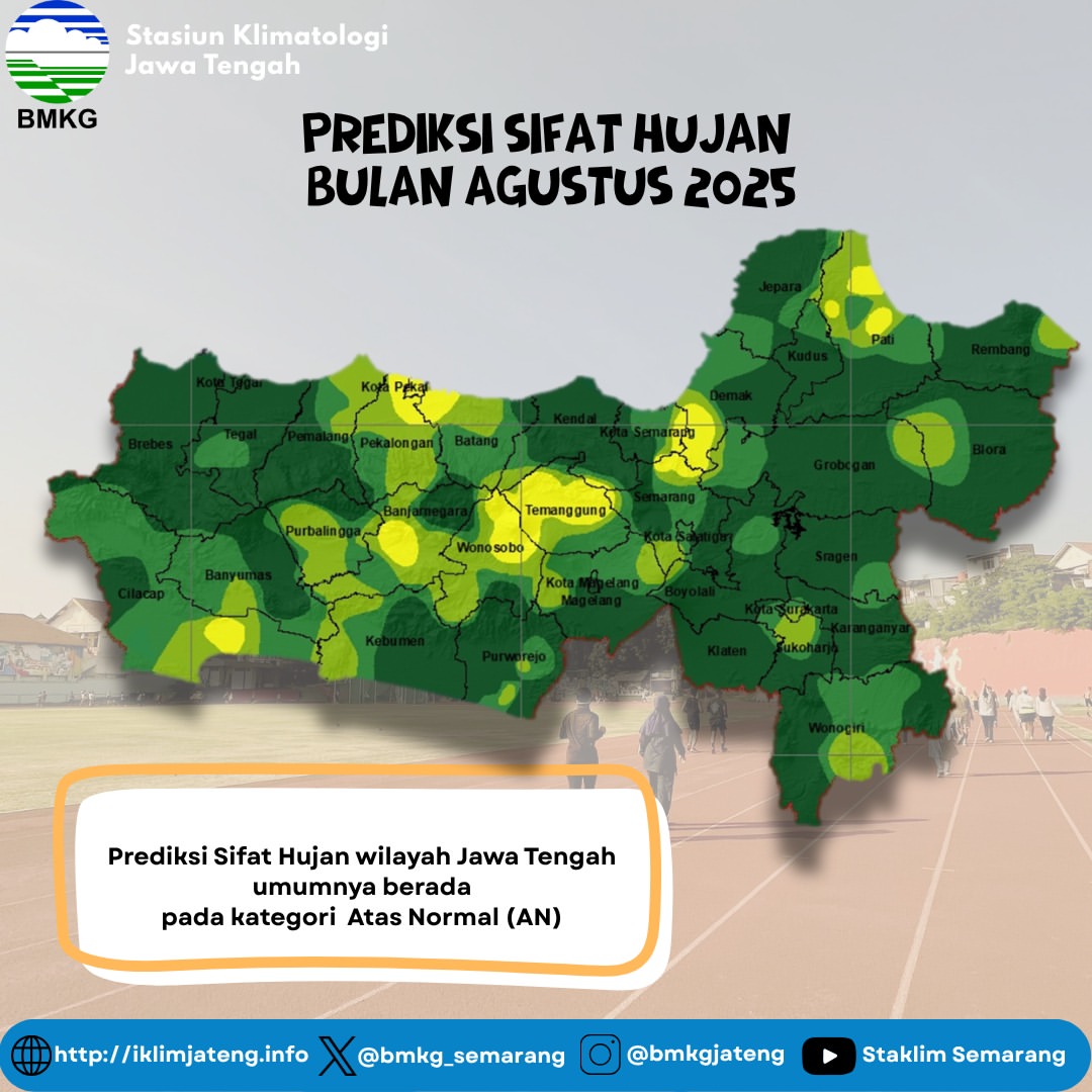 Badan Meteorologi, Klimatologi, dan Geofisika (BMKG) Stasiun Klimatologi Jawa Tengah menghadirkan informasi rangkuman analisis serta prediksi hujan untuk periode Agustus 2025. Informasi ini bermanfaat untuk membantu masyarakat, petani, nelayan, maupun pemerintah daerah agar lebih siap menghadapi perubahan cuaca dan iklim di Jawa Tengah.