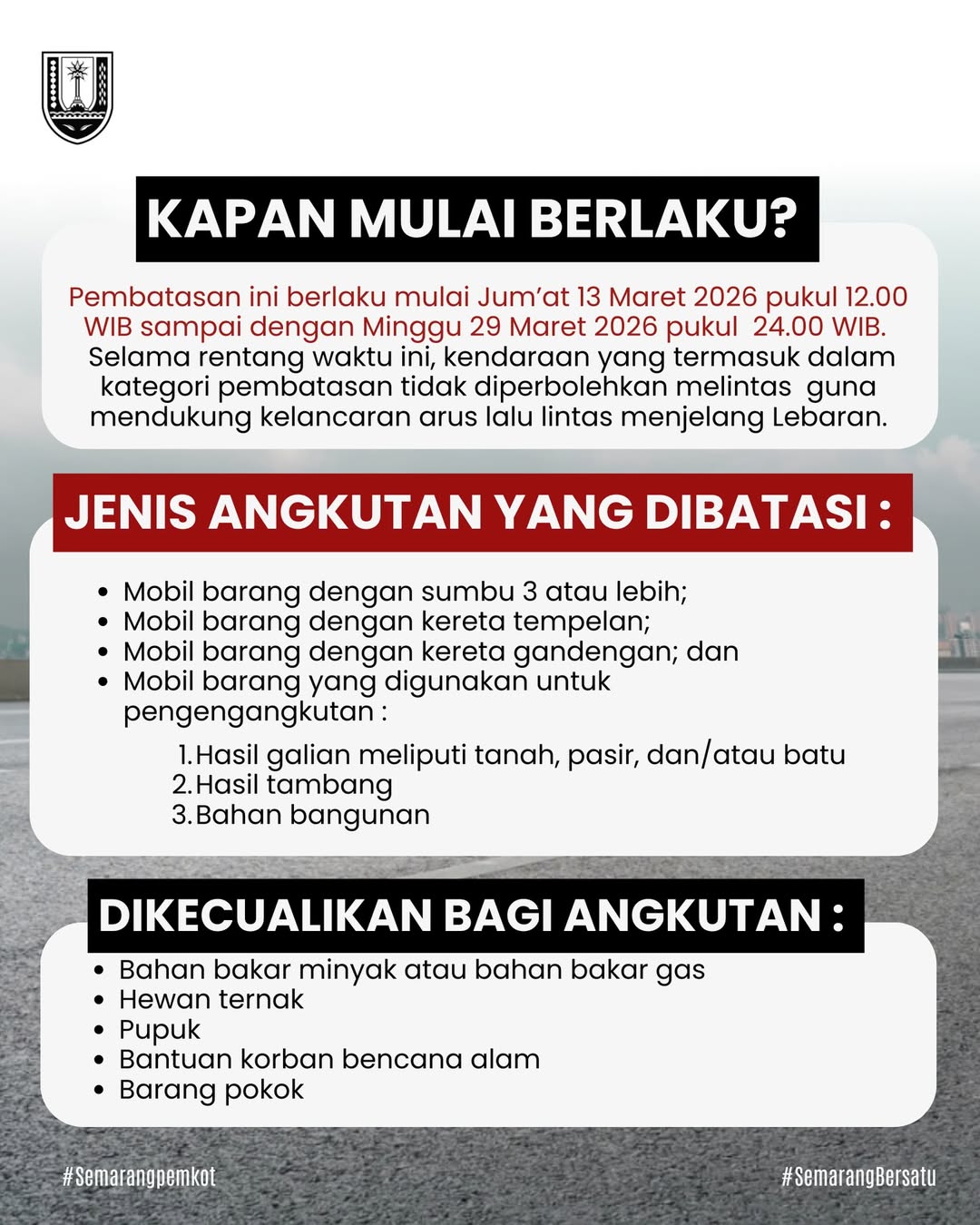 Dalam rangka mendukung kelancaran arus mudik dan arus balik Lebaran 1447 H, pemerintah memberlakukan pembatasan operasional angkutan barang di sejumlah ruas jalan tol dan non-tol. Kebijakan ini tertuang dalam Surat Keputusan Bersama (SKB) antara Kementerian Perhubungan, Kementerian Pekerjaan Umum, dan Korps Lalu Lintas Polri tentang Pengaturan Lalu Lintas Jalan serta Penyeberangan Selama Masa Angkutan Lebaran 2026.