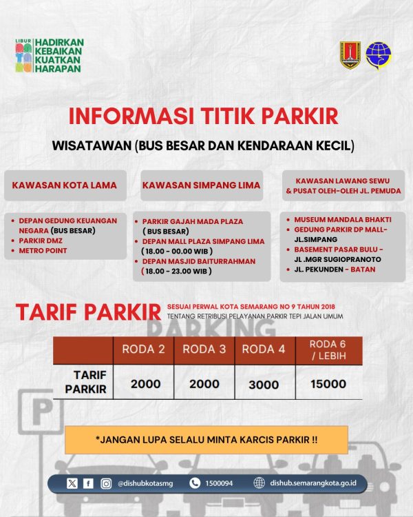 Berikut adalah rangkuman informasi mengenai titik dan tarif parkir bagi wisatawan (bus besar dan kendaraan kecil) di Kota Semarang :