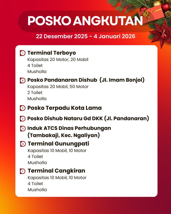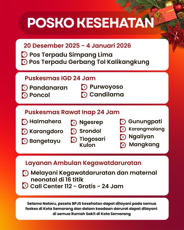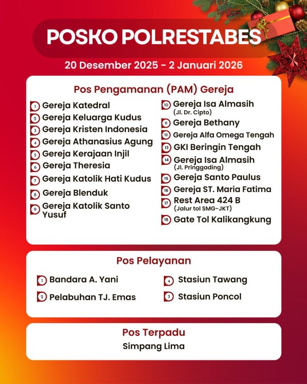 Dalam rangka menyambut perayaan Natal 2025 dan Tahun Baru 2026 (Nataru), Pemerintah Kota Semarang bersama Polrestabes Semarang dan instansi terkait menyiapkan sejumlah posko pengamanan, posko pelayanan, dan posko angkutan di berbagai titik strategis. Langkah ini dilakukan untuk memastikan keamanan, kenyamanan, dan kelancaran aktivitas masyarakat selama masa libur akhir tahun.