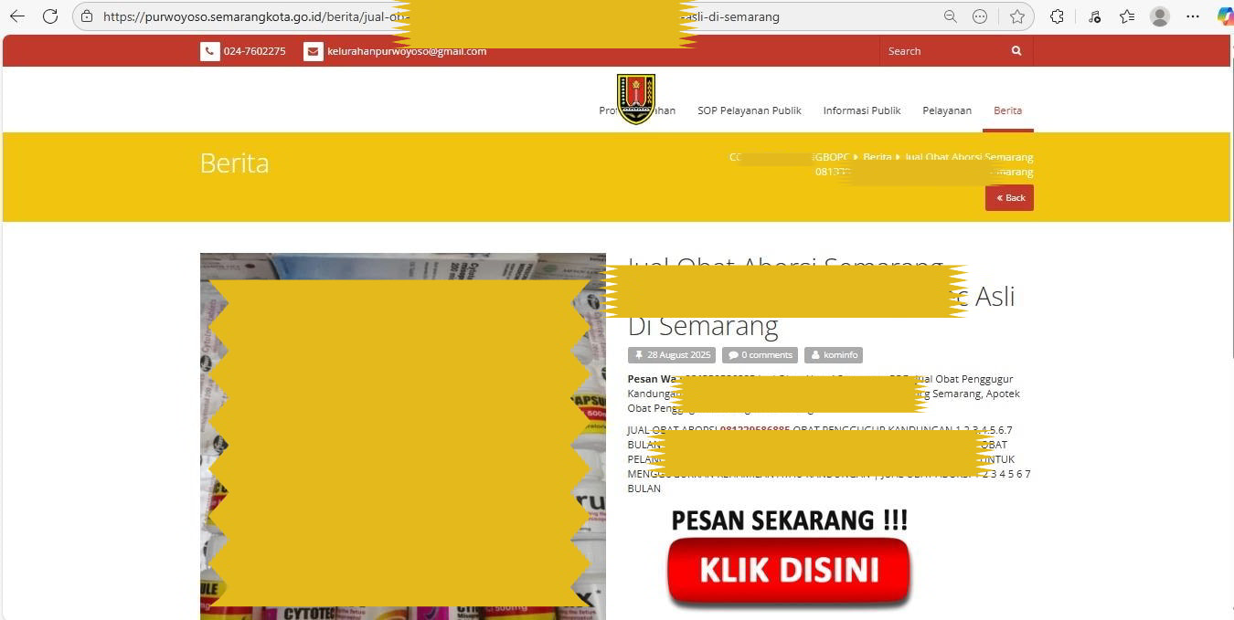 Kami ingin memberitahukan kepada seluruh masyarakat bahwa website resmi Kelurahan Purwoyoso (purwoyoso.semarangkota.go.id) telah mengalami insiden siber. Kejadian ini mengakibatkan adanya konten tidak relevan yang muncul di halaman website, seperti promosi jual-beli obat, yang tidak bertanggung jawab dan tidak terkait dengan layanan resmi kelurahan.