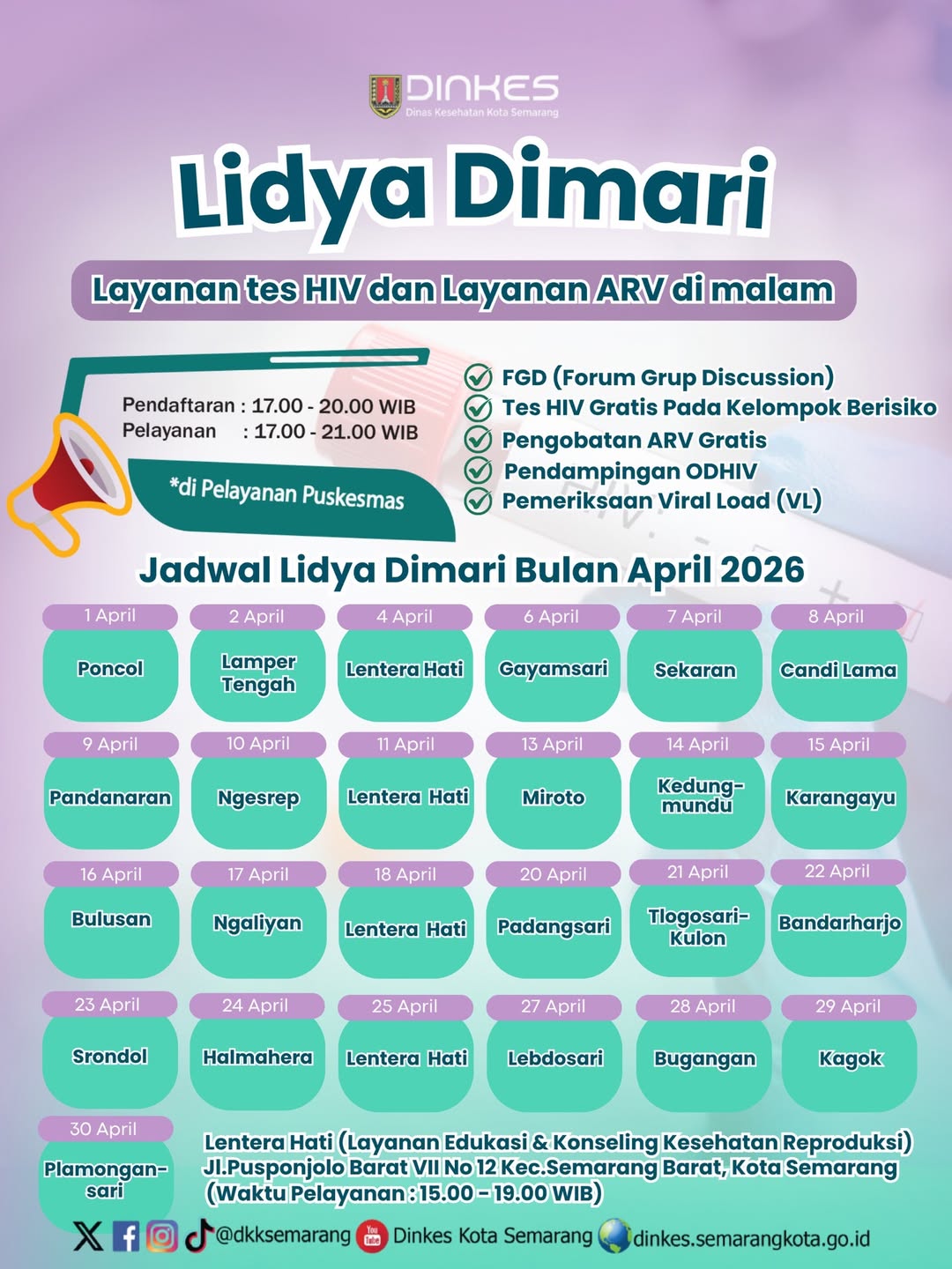 Jadwal Layanan Tes HIV dan Layanan ARV (Lidya Dimari) Dinas Kesehatan Kota Semarang April 2026