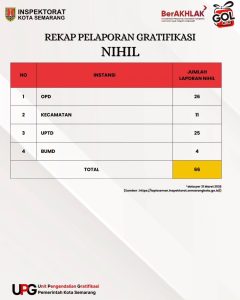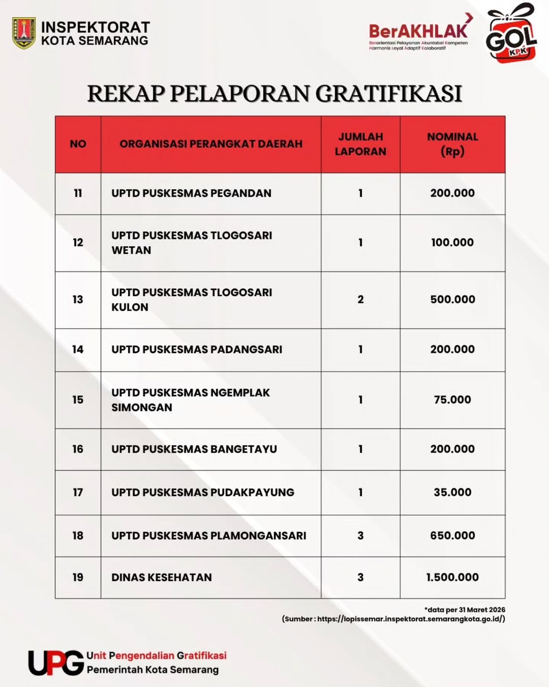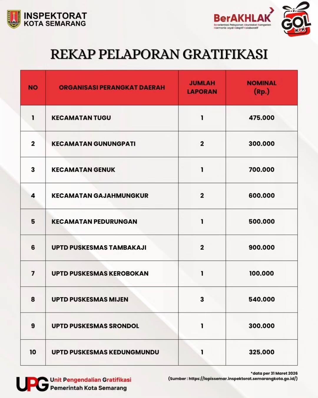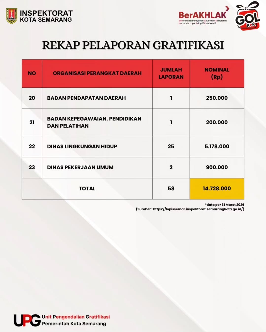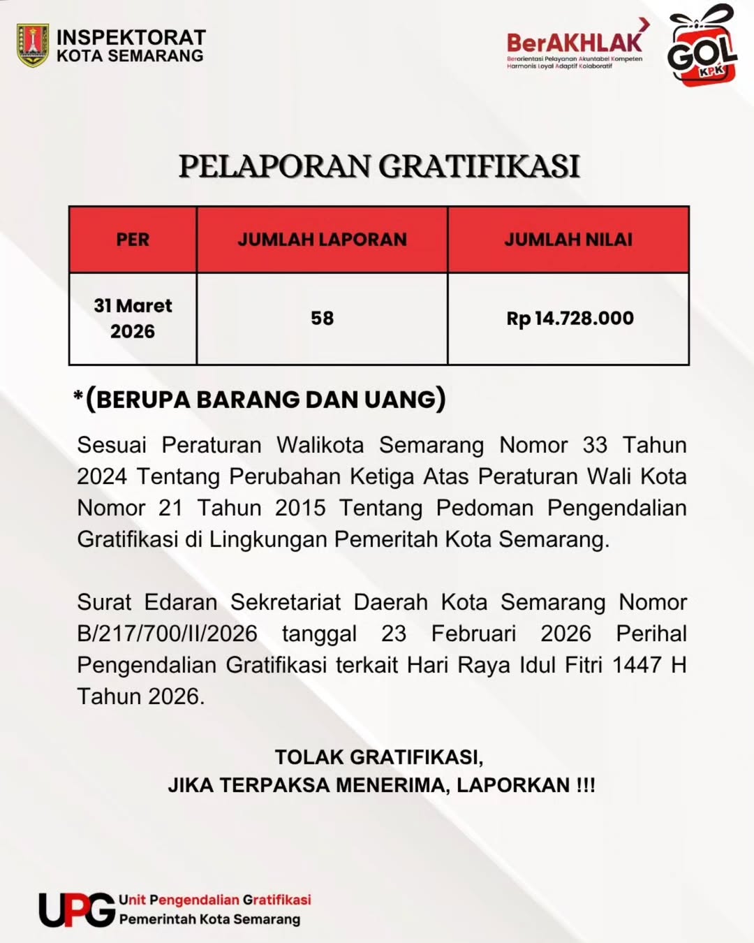 Per 31 Maret 2026, Pemerintah Kota Semarang mencatat 58 laporan gratifikasi melalui aplikasi LOPISSEMAR (Laporan Gratifikasi Kota Semarang). Selain itu, total nilai gratifikasi mencapai Rp14.728.000 yang terdiri dari barang dan uang.