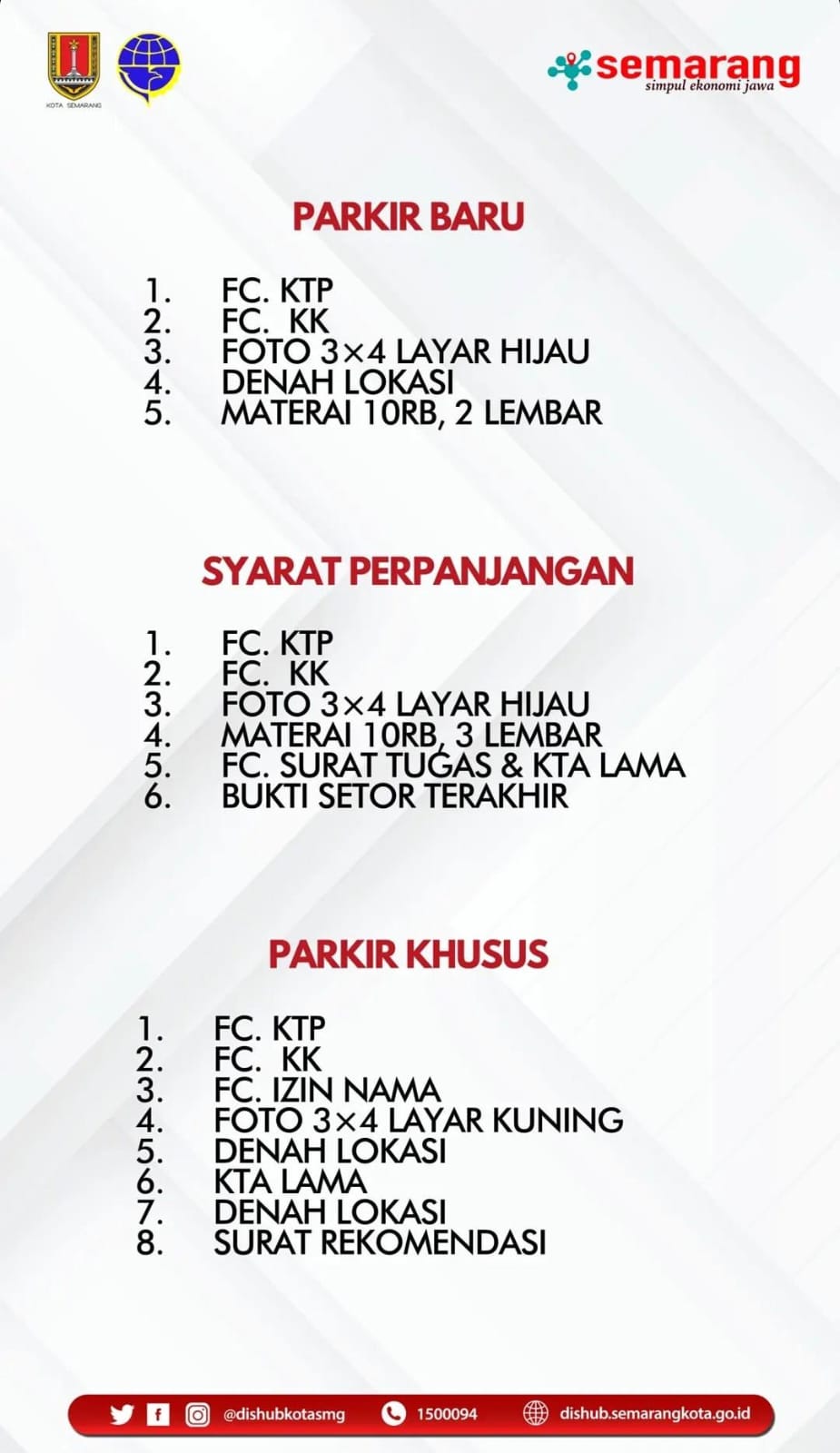 - Datang langsung ke loket pendaftaran izin parkir Khusus Halaman Sendiri Dinas Perhubungan Kota Semarang