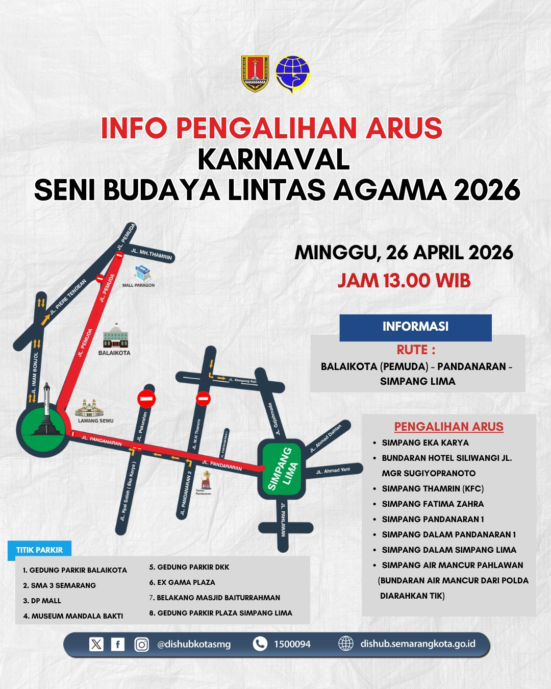 Karnaval Seni Budaya Lintas Agama 2026 akan berlangsung di Kota Semarang. Dinas Perhubungan Kota Semarang menerapkan rekayasa dan pengalihan arus untuk menjaga keamanan dan kelancaran.