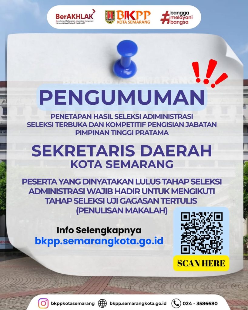 Hasil Seleksi Administrasi Seleksi Terbuka dan Kompetitif Pengisian Jabatan Pimpinan Tinggi Pratama Sekretaris Daerah Kota Semarang telah ditetapkan.