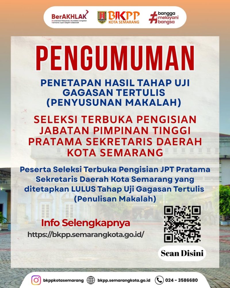 Hasil Tahap Uji Gagasan Tertulis (Penulisan Makalah) dalam rangka Seleksi Terbuka Pengisian Jabatan Pimpinan Tinggi Pratama Sekretaris Daerah Kota Semarang telah ditetapkan.