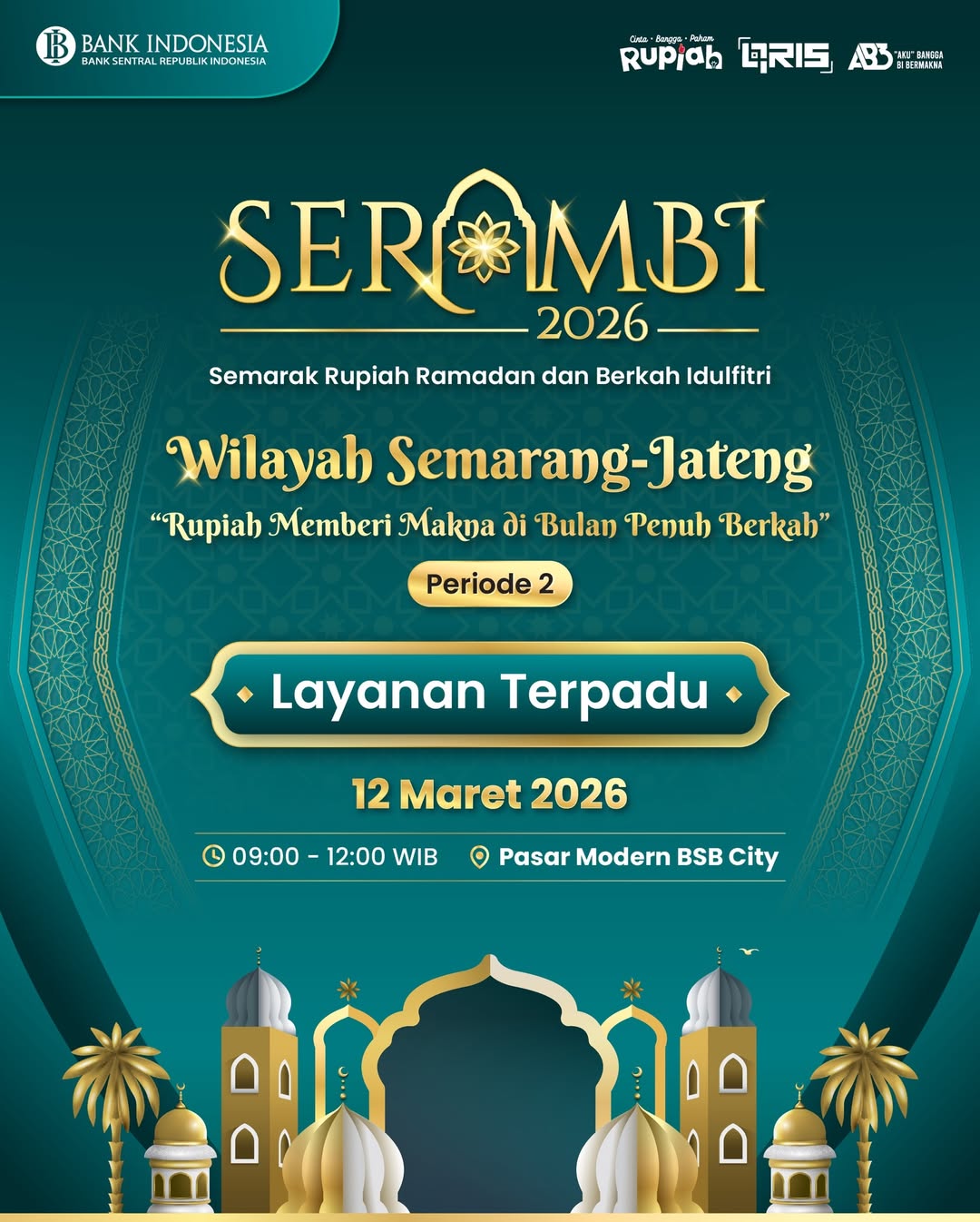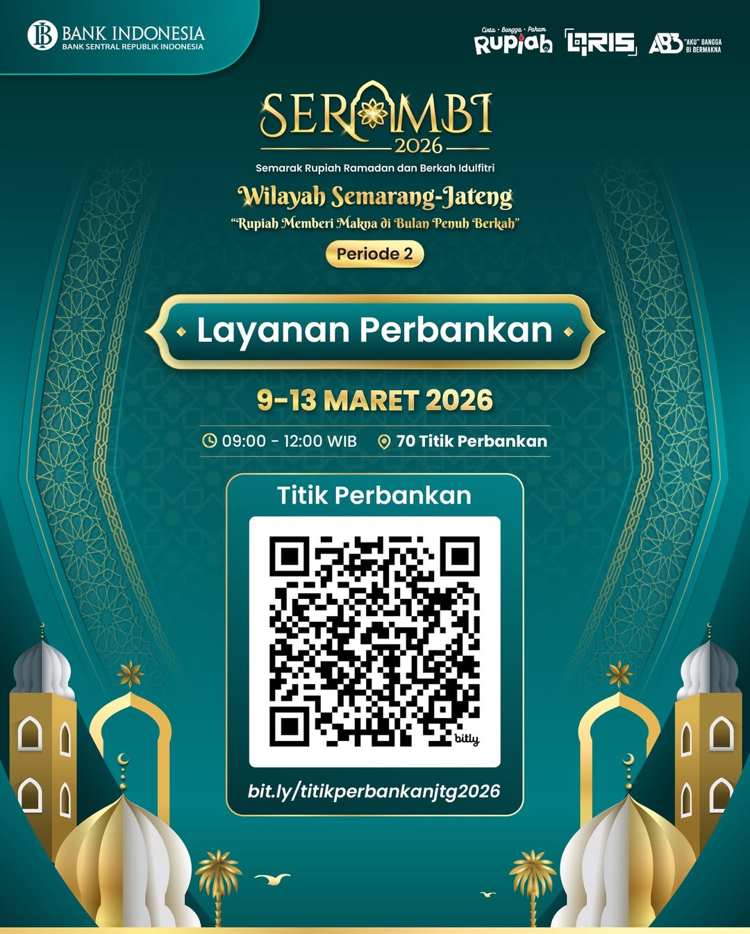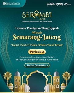 Kantor Perwakilan Bank Indonesia Provinsi Jawa Tengah bekerja sama dengan perbankan lainnya menyelenggarakan Layanan Penukaran Uang Rupiah sebagai bagian dari rangkaian kegiatan SERAMBI – Semarak Rupiah Ramadan & Berkah Idul Fitri 2026. Pada tahun ini, kegiatan tersebut mengangkat tema “Rupiah Memberi Makna di Bulan Penuh Berkah”.