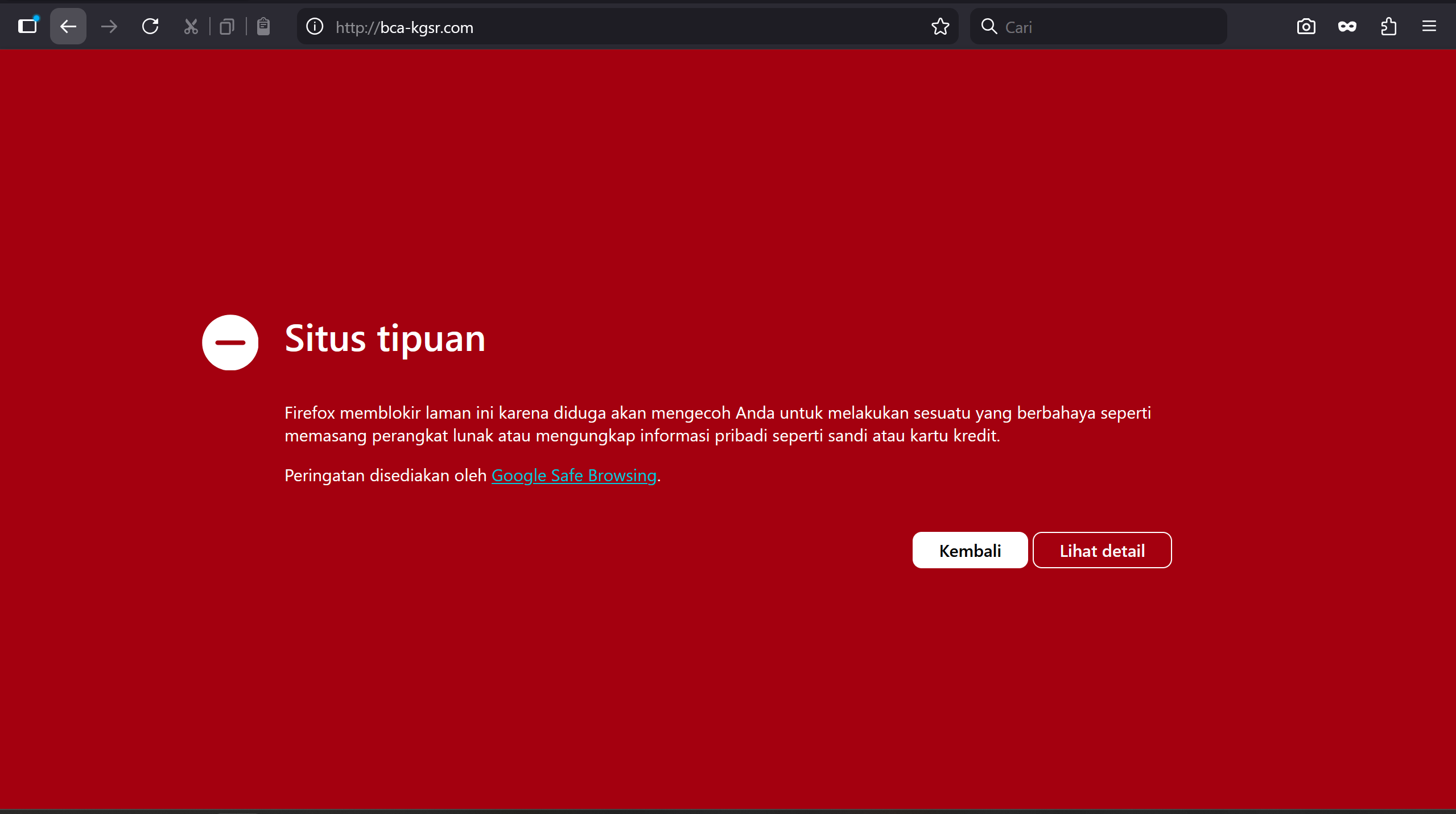 - Perhatikan alamat link tersebut. Website resmi BCA adalah bca.co.id. Link seperti bca-kgsr.com atau bca-mobile-poin.com adalah palsu dan dibuat oleh penipu untuk mencuri data perbankan Anda.